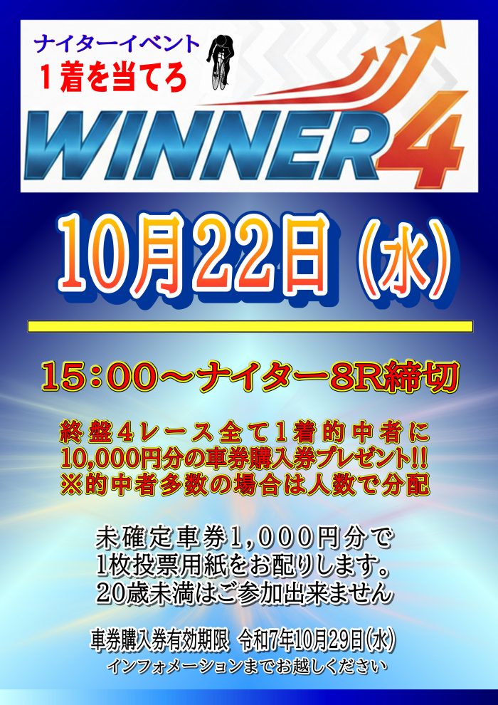 新ナイターイベント『WINNER4』! 25/10/19 最近の投稿 LINE登録者限定!10ポイントデー 新ナイターイベント『WINNER4』! 新イベント『WINNER3』! チャレンジ3連単 10月 サービス終了のお知らせ アーカイブ 2025年10月 2025年4月 2025年3月 2025年1月 2022年11月 カテゴリー NEWS&TOPICS イベント情報 未分類