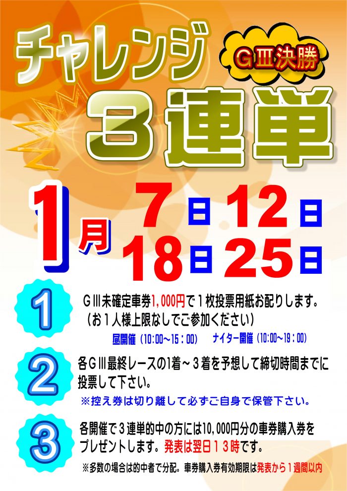 チャレンジ3連単 26/01/07 最近の投稿 2026年1月~最大4場発売へ拡大しました! 「WINNER4」ナイター開催人気イベント! 1月11日(日)毎月第2日曜日は「ひがいも輪五郎市」! チャレンジ3連単 サービス終了のお知らせ アーカイブ 2026年1月 2025年10月 2025年4月 2025年3月 2025年1月 2022年11月 カテゴリー NEWS&TOPICS イベント情報 未分類