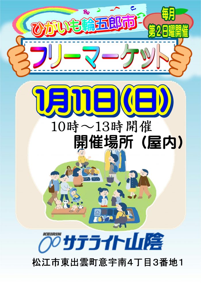 1月11日(日)毎月第2日曜日は「ひがいも輪五郎市」! 26/01/07 最近の投稿 2026年1月~最大4場発売へ拡大しました! 「WINNER4」ナイター開催人気イベント! 1月11日(日)毎月第2日曜日は「ひがいも輪五郎市」! チャレンジ3連単 サービス終了のお知らせ アーカイブ 2026年1月 2025年10月 2025年4月 2025年3月 2025年1月 2022年11月 カテゴリー NEWS&TOPICS イベント情報 未分類